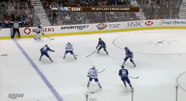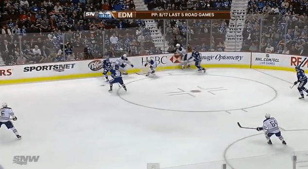 Higgins and Burrows force Jordan Eberle into attempting a very low percentage play. Edmonton’s three left wingers remain open.