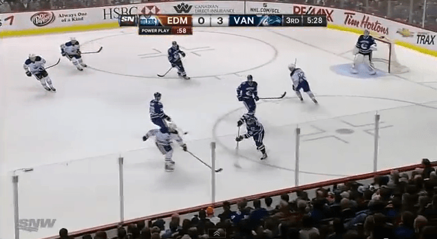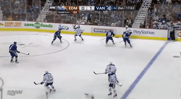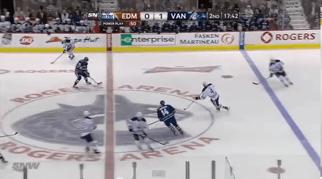 Higgins clearing the zone (like a boss). Again, another great example of Vancouver’s aggressiveness. Three Canucks and two Oilers involved in the play.