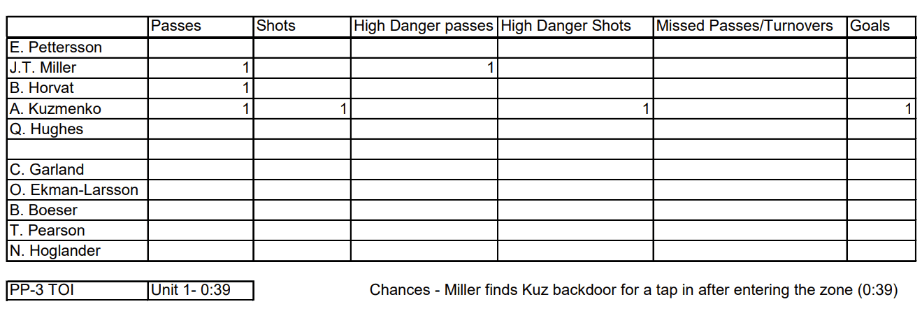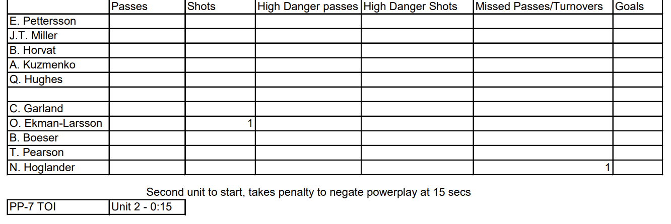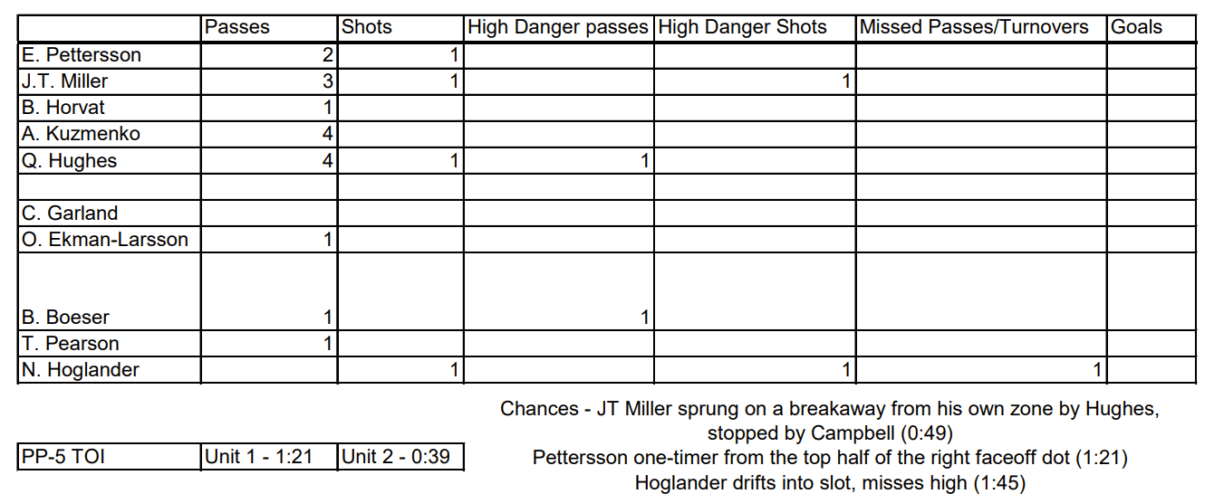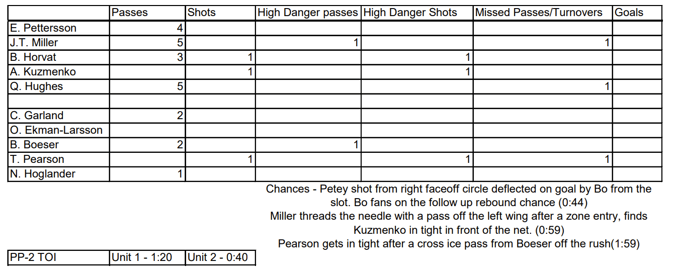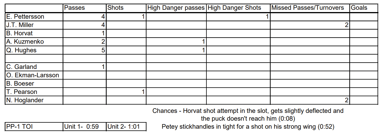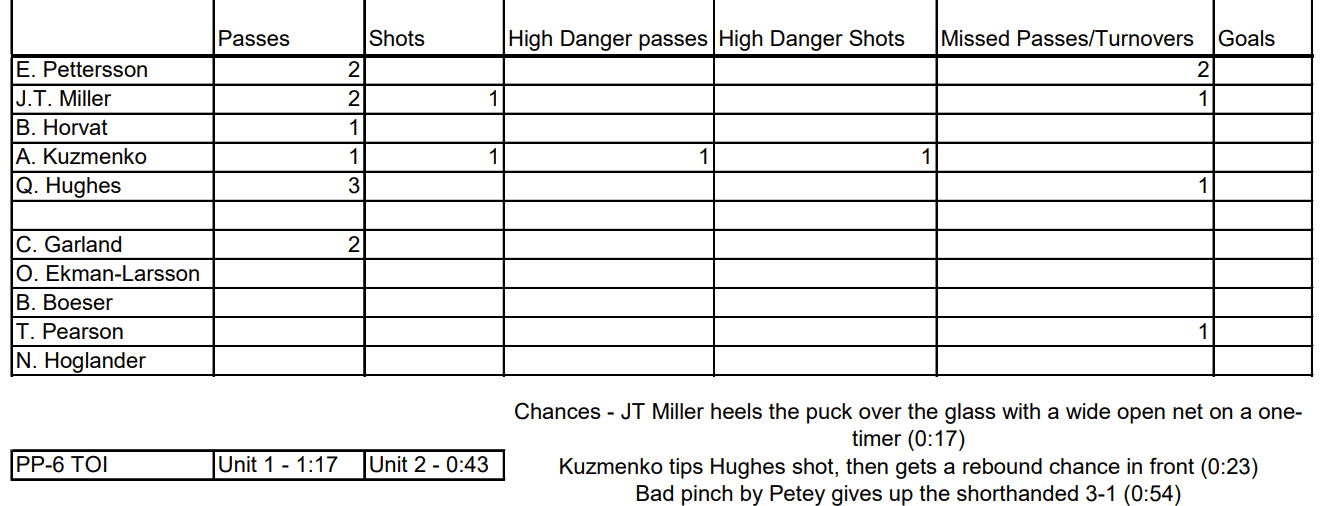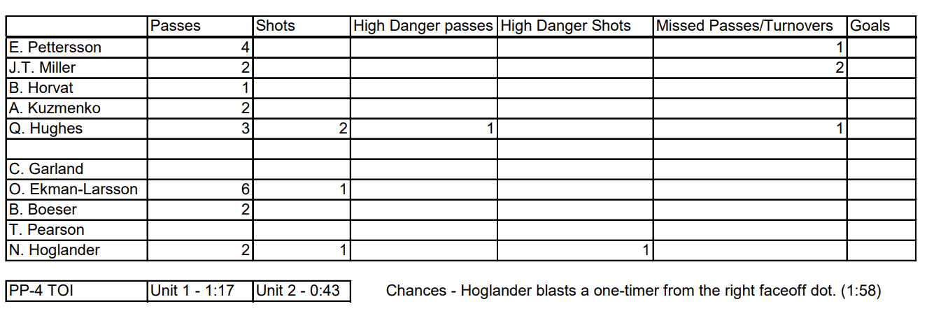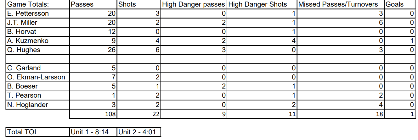 - A testament to how much the first unit passes can be seen when Oliver Ekman-Larsson joined them in the place of a bleeding Quinn Hughes. Just on that power play alone, the defenceman recorded 6 passes out of his 7 total.