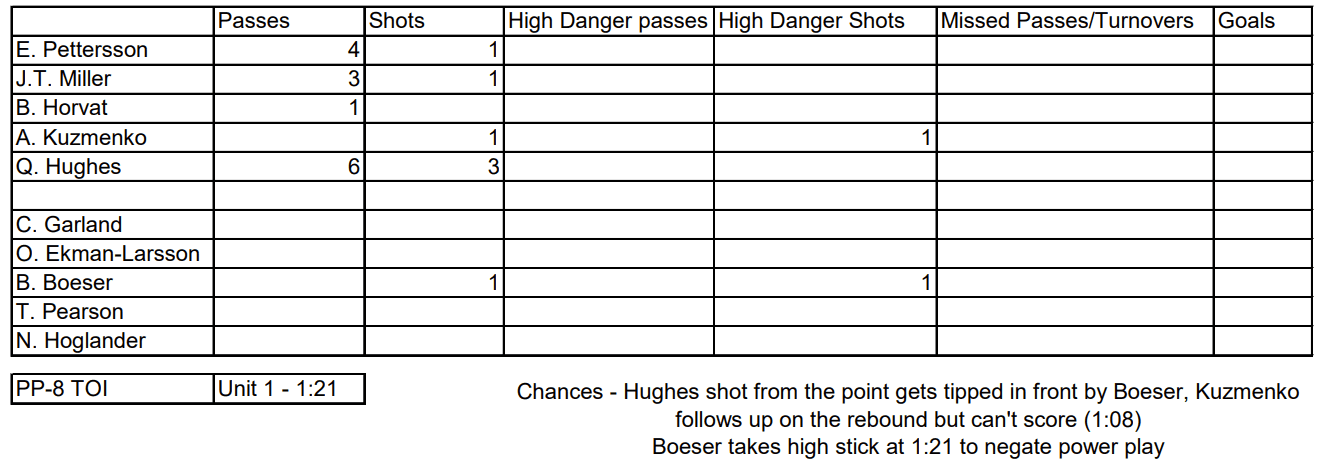 The biggest takeaway from reviewing the power plays and tracking some stats is that the Canucks pass way too much for the amount of scoring chances they generate. It’s also not as if the passes they’re making are particularly risky as well, with a lot of winger-defenceman or winger-winger exchanges. If there is a time to be making higher-risk passes, it’s when an opposing team is down a man, affording less coverage area in the defensive zone.