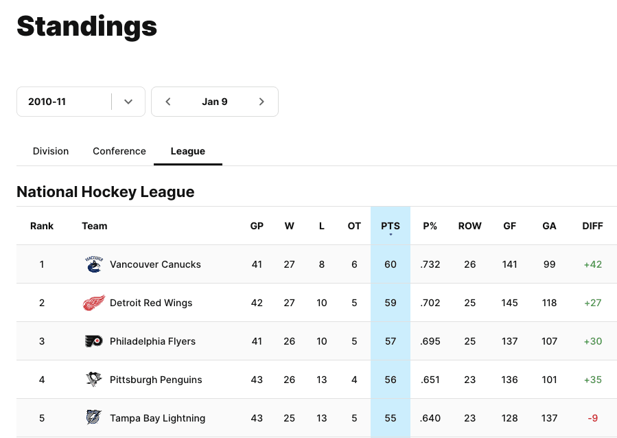 The 2010-2011 Canucks were first in the NHL with 60 points, with a one-point lead over the Detroit Red Wings at the 41-game mark. They had the most wins and regulation wins with a league-leading .732-point percentage.