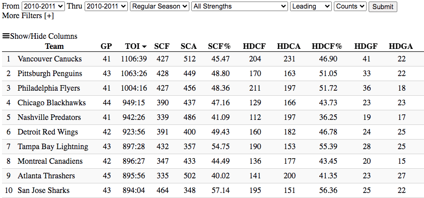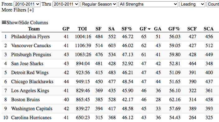 The 2010-2011 Canucks team had the fourth-highest scoring chances (SCF) (427), trailing the San Jose Sharks by 37, and second in goals for (GF) (62), trailing only the Philadelphia Flyers by three.