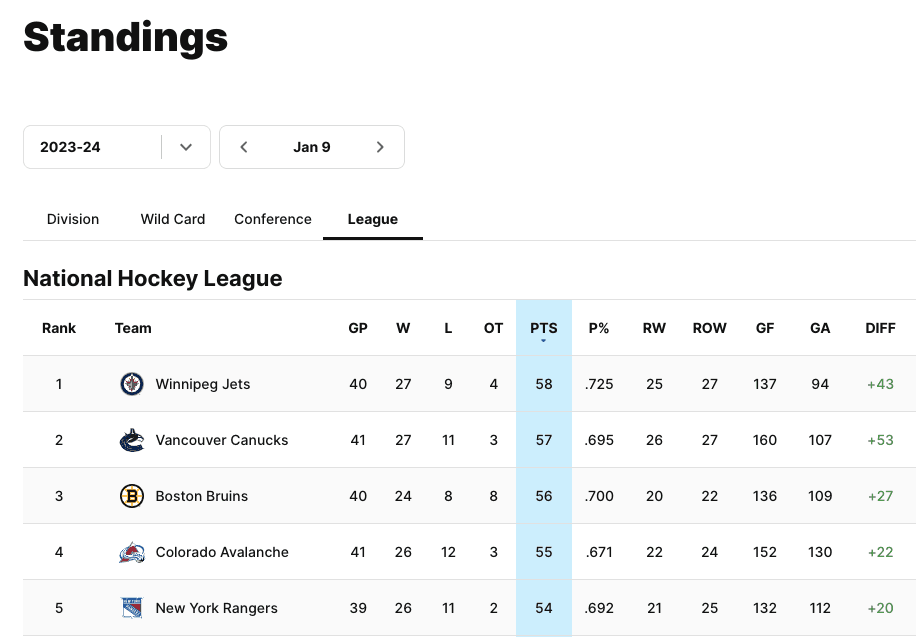 After the first 41 games of the season, this 2023-2024 Canucks team was second in the NHL with 57 points, one point behind the leading Winnipeg Jets. Based on points percentage, they ranked third with a .695%. Points percentage may be the more indicative stat to look at when evaluating teams’ success, as it shows how many points the team has earned based on the number of games they’ve played.