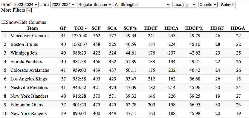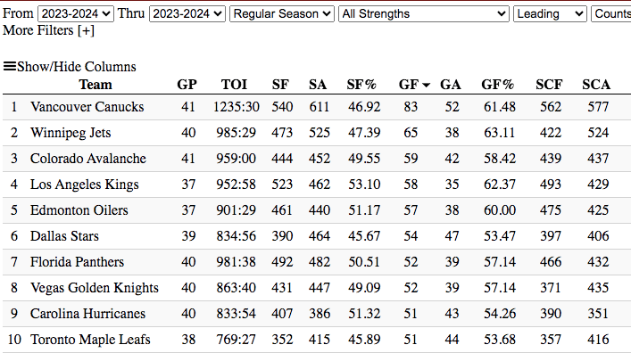 The 2023-2024 Canucks team had the most scoring chances (SCF) (562), leading the Los Angeles Kings by 69, and also had the most goals for (GF) (83), 18 more than the Winnipeg Jets.