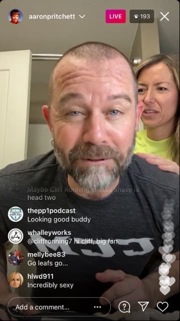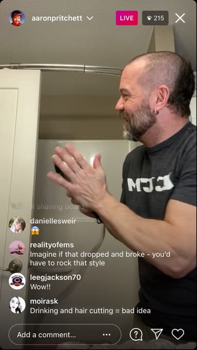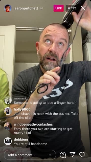 So to be fair, Aaron wasn’t going “bald bald” but he’d take it down to a kiwi length on his Instagram page, and we lived through him for one night. His girlfriend Sarah helped the night along and at first, it was ok.