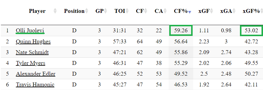 From my calculations, Juolevi has played 80.7% of his 5-on-5 ice time against bottom-six competition. This is a situation for him to be given the best chance for success. It is showing in the early returns as Juolevi holds the highest Corsi percentage and control of expected goals out of each defenceman.