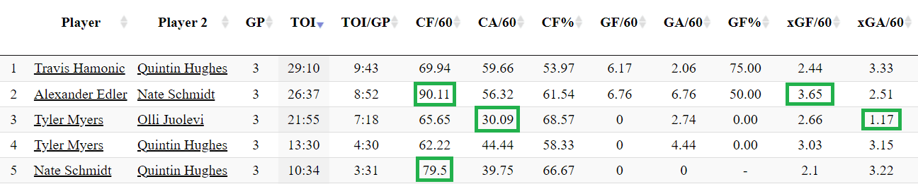 For example, the Hamonic-Hughes pairing has had tough minutes against top competition while playing a lot with the Elias Pettersson line. The Edler-Schmidt pairing has been taking on the medium-tough competition while getting a lot of time with the Bo Horvat line. The Olli Juolevi and Tyler Myers pairing has played much more sheltered minutes against weaker competition while being saddled up with the Adam Gaudette line.
