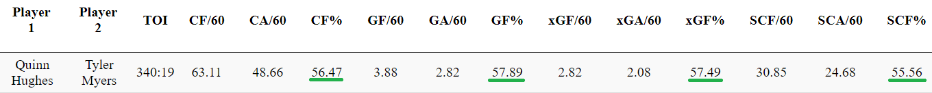 Anyone concerned about Myers and Hughes defensively may be overreacting to the big giveaways that happen which result in goals. Those happen at times. From a 340 minutes sample size, the pairing does a fine job of keeping the puck out of their net while throwing a ton of attempts at the opposition’s net.