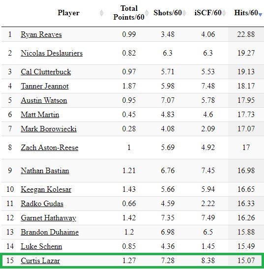 Out of those skaters who finished top-15 in hits per 60, Lazar was first in individual scoring chances per 60, second in shots per 60, and fourth in points per 60. He is one of the top initiators of physicality in the NHL but also has good enough hands to get scoring chances with consistency.