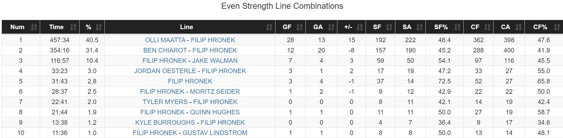 It’s not even that Maatta is particularly good; he’s not. He’s a fairly average, bottom-end top-four defender, and has been for his entire career. It’s just that he’s the first partner to not actively weigh Hronek down, and thus we can take their numbers together as perhaps the best indication of the “true” Hronek.