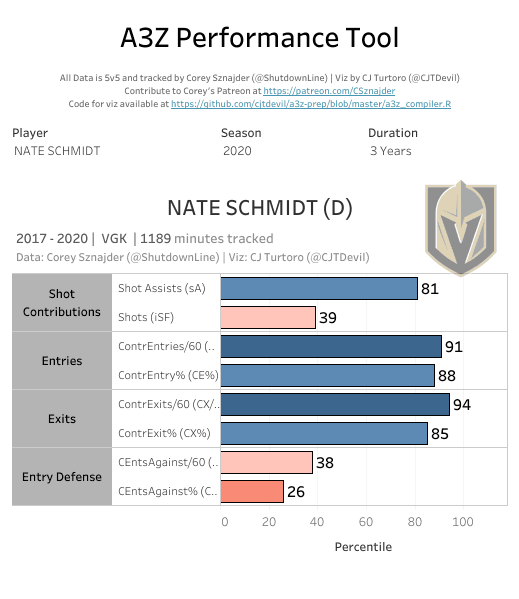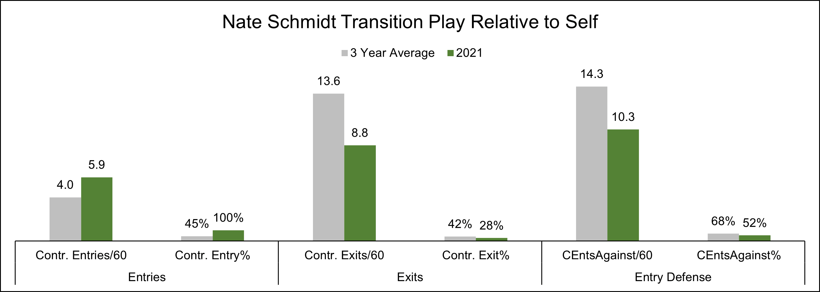 With the puck, Schmidt helped his team exit the defensive zone and enter the offensive zone at an elite rate. However, without the puck, Schmidt struggled to defend in transition against opposing controlled entries.