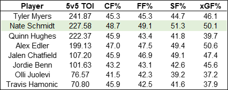 In isolation, comparing Schmidt to his trailing three-year career average can only tell us so much. After all, he was playing on a completely different team and system prior to this season. When compared to his fellow Canucks defencemen this season, however, Schmidt still stands out.