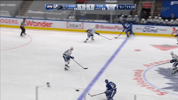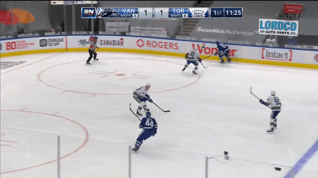Instead, Schmidt takes a quick look at Myers once he corrals the puck, realizes there is another Montreal forechecker fairly tight on his defence partner, and quickly makes a sharp turn to the right to shake off Tatar before dishing to Roussel, who gives it to Pearson for a clean, controlled exit. It’s plays like these that the Canucks were looking for in Schmidt, and the more he’s able to help the Canucks in this regard, the better.