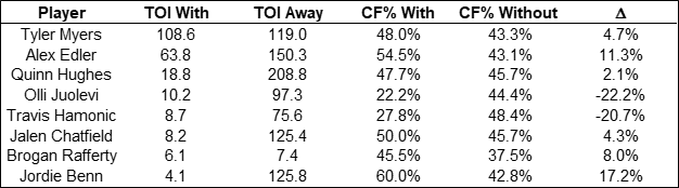 At 5-on-5, Schmidt’s most common partners have been Tyler Myers and Alex Edler, both of whom have fared better on a Corsi basis when playing with Schmidt. Nolan Baumgartner has kept his defence pairs relatively stable outside of forced changes through injury, and at this point in the season, there isn’t enough data to conclude Schmidt’s effect on each of Vancouver’s defencemen outside of his main partners. What’s clear from this graphic, however, is that between Myers and Edler, both have benefited greatly from playing with Schmidt.