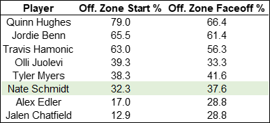 Here, we can see that Schmidt starts roughly a third of his shifts in the offensive zone, which is third-to-last on the Canucks. Again, we see that Schmidt doesn’t necessarily have the starting territorial advantage that some other Canucks defenders benefit from.