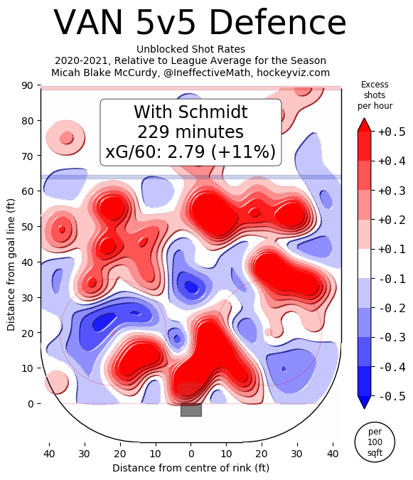 Again, this is more of a testament to the Canucks’ leaky defensive start than anything else. Schmidt isn’t necessarily known for his in-zone defensive skills, as he’s a defenceman that best defends by transporting the puck quickly to avoid a defensive situation at all. Overall, however, it’s clear that the Canucks do benefit from the presence of Schmidt every time he’s on the ice.