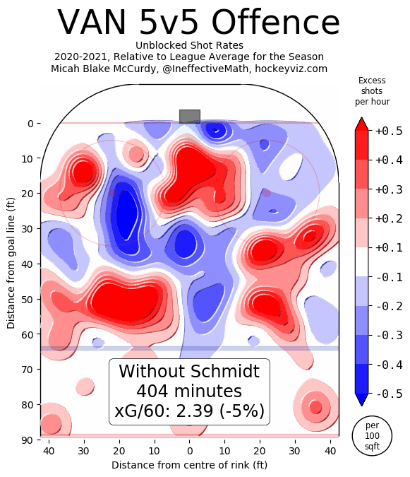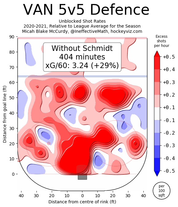 From the team perspective as a whole, we can see from the chart below that the Canucks’ offence is about 4% more potent at evens with Schmidt on the ice when using xG/60, no doubt due to his zone entry abilities and strong skills in the offensive zone once he enters. In the 404 minutes that the Canucks have played without Schmidt, their xG/60 drops to 5% below league average.