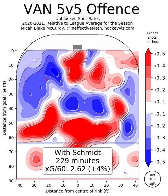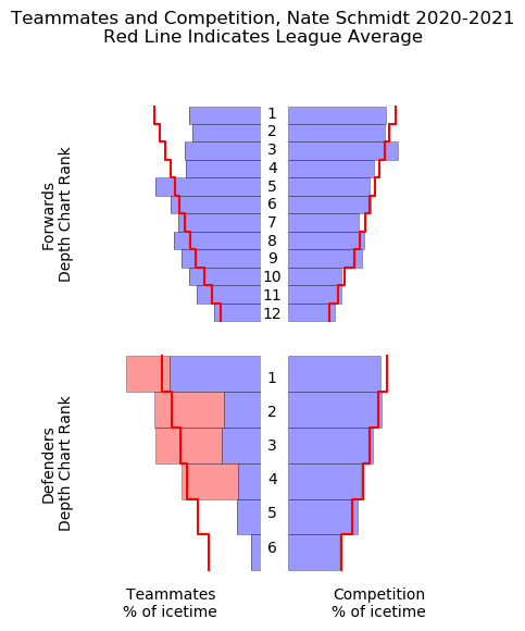 Of course, it’s also important to take deployment into account. The chart below shows Schmidt’s deployment and provides critical context in terms of teammates and competition every time Schmidt steps over the boards.