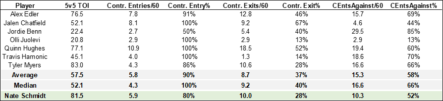 As we can see, Schmidt’s matchup difficulty level generally falls in line with the league average. However, he shares the ice with his team’s first line far less than that of the league average, which is undoubtedly a result of Travis Green’s preference to deploy Quinn Hughes with the Lotto Line in most instances. This means that he’s taking to the ice with lower quality teammates, on average, despite facing average levels of difficulty in terms of opposition. The fact that Schmidt is able to post strong numbers despite this type of deployment is a testament to his ability to control the play regardless of the quality of teammates that are playing with him.