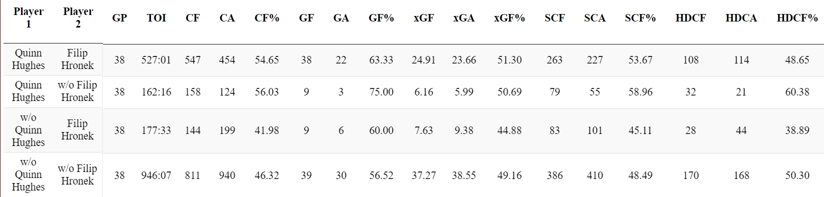When folks talk about Hughes’ impact on Hronek and vice-versa, they’re mainly talking about WOWY stats, or “with or without you.” Cue the U2.