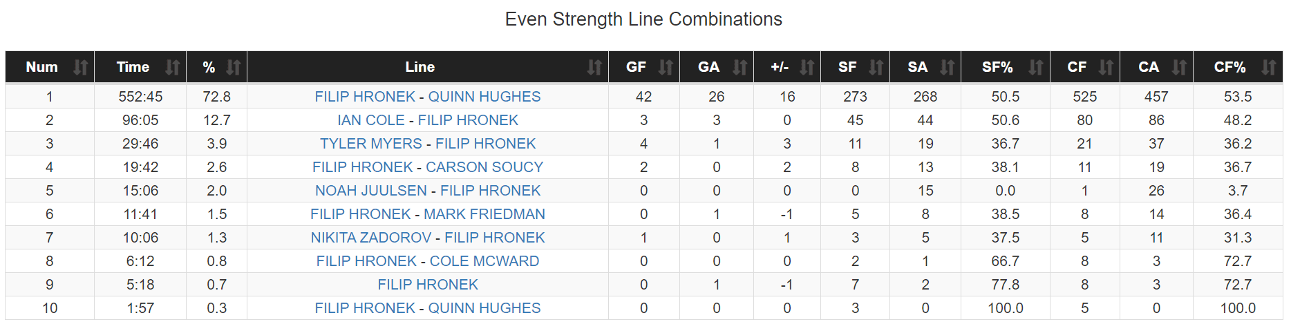 After Cole, Hronek’s next most-frequent partner is Tyler Myers, but that’s just 29:46 of ice-time. In those minutes, Hronek and Myers are +3 with a Corsi of 36.2%, which are decidedly mixed results across a miniscule sample size.
