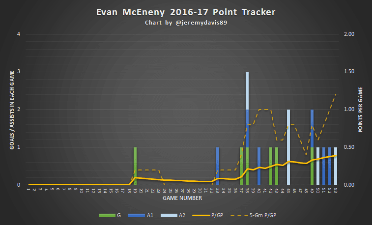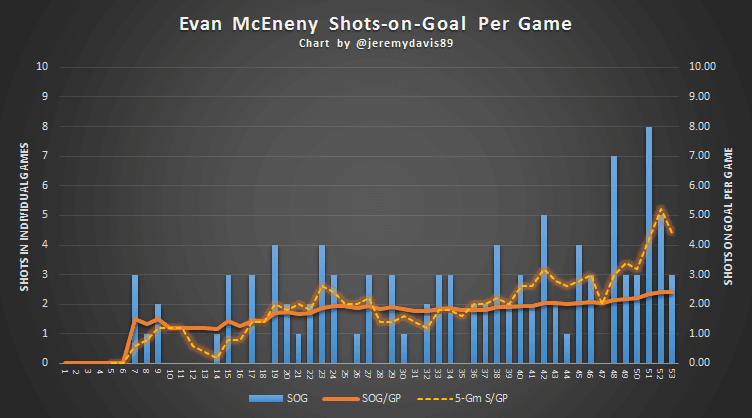 What began as a bit of a hot streak has turned into something more, and given McEneny’s history of point production at other levels, and his underlying numbers, it’s looking more and more reasonable that this current McEneny is the true version, and it was the unproductive version at the start of the year that was the aberration.