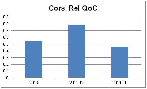 Corsi Rel QoC, as a quick refresher, is a measure of quality of opposition. It isn’t a perfect measure, but it does do a good job of telling us if a player is going up against top lines or third and fourth offensive units. It tells us who the coaches trust against the good players. Over the last three seasons, Hansen’s Corsi Rel QoC team ranks have been sixth, third, and fourth, respectively.