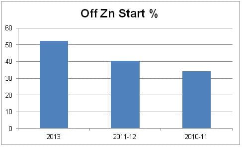 And this past season was the first time that Hansen saw over 50% of his shifts start off in the offensive zone (and this chart makes his 16-goal campaign in 2011-12 even more impressive). He was buried defensively in both 2010-11 and 2011-12.