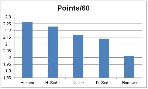 Hansen also led the Canucks in even strength points per 60 minutes in 2013 (from Hockey Analysis):