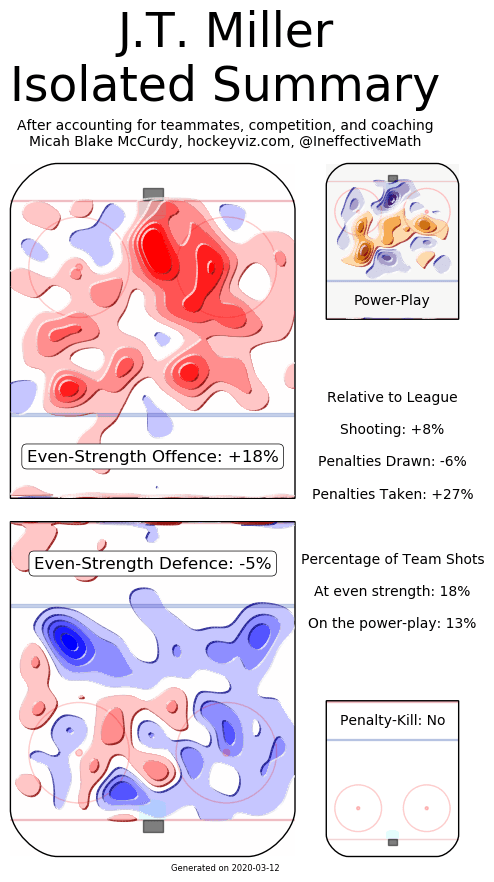 Sliding onto a top line with Elias Pettersson and Brock Boeser, Miller has had very positive impacts on both of their respective 5v5 numbers significantly boosting their underlying numbers.