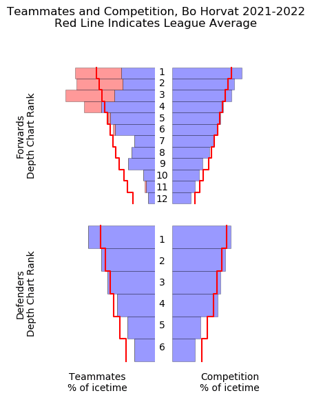 In 2021/22, Horvat skated an average of 19:31 in ice-time per game. During those 19:31 minutes that were even-strength, Horvat started about 56% of them in his own end. Of those 19:31 minutes, more than two-thirds of them saw Horvat lining up against top-six opposition.