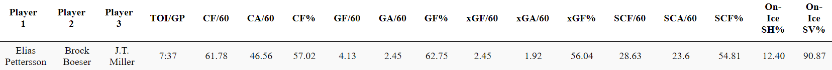 The Horvat line has benefitted from a 15% shooting percentage in the early parts of the season and that likely won’t be sustainable as the year goes on. They are also dealing with their goaltenders having a .880% save percentage at five-on-five and that should creep up over .900 as the season goes on. With those numbers, they have outscored their opponents six to three when it comes to goals scored at even strength.
