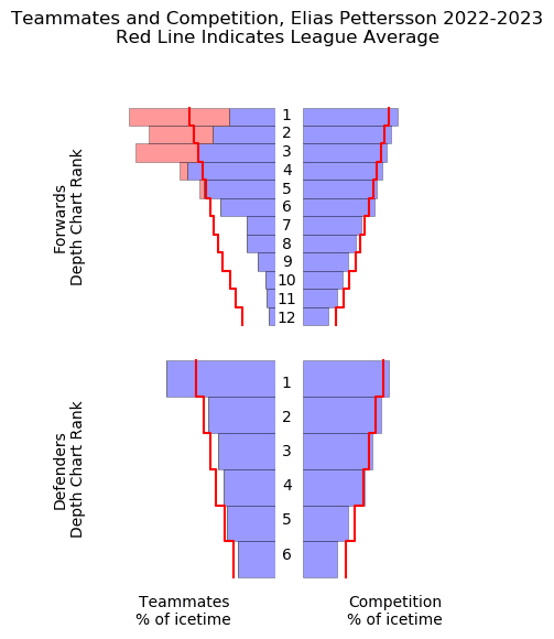 To say that Pettersson was used as a shutdown center in 2022/23 would be inaccurate. But he did play more of his minutes against opposition scoring lines than the average center, and he did start fewer of his shifts in the offensive zone (54%) than ever. (Previously, his career average for OZ starts had been in the 60s).