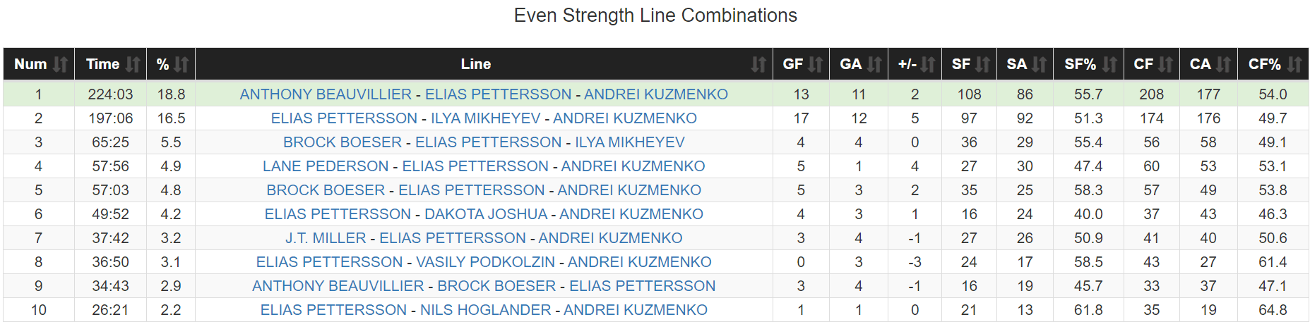 From the get-go, Pettersson and Andrei Kuzmenko had obvious chemistry, and Pettersson would wind up sharing almost 90% of his even-strength minutes with the first-year winger. In fact, the only major disruption was their usual linemate, Ilya Mikheyev, getting injured, and then eventually replaced by Anthony Beauvillier.