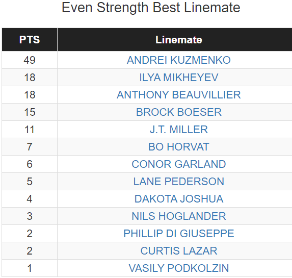 Pettersson scored at about the same rate no matter who he was lined up with, and managed to put up solid point totals alongside Brock Boeser, JT Miller, and even Lane Pederson, too.