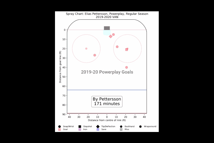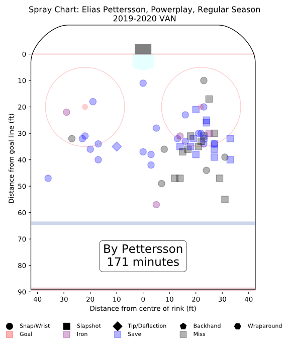 He only has one power play goal from the “Petterzone” this season, but has hit the bar a few times and missed the net on a lot of shot attempts this season. Here are the shot attempts that either missed the net or were saved from this season.