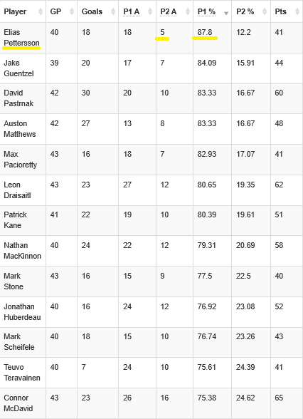Pettersson currently ranks fifth in the NHL among players with a minimum of 30 points in primary point percentage, with 87.8% of his point coming from a goal or a first assist. If you look at all the players that have more than 40 points this season, Elias Pettersson leads all the NHL with his primary point percentage.