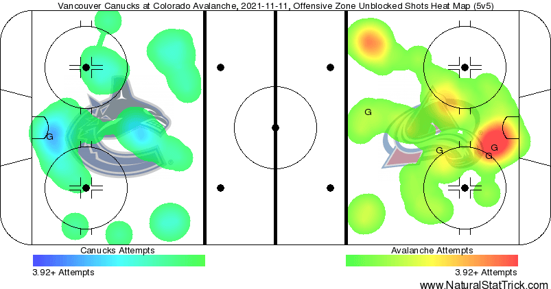 According to Natural Stat Trick, the Canucks are currently fifth last in High Danger Scoring Chances percentage at 44.60 percent. Take one look at the shot map from last night, and it shows what a difference that makes against a team like Colorado, who’s currently second in the league at 57.56.
