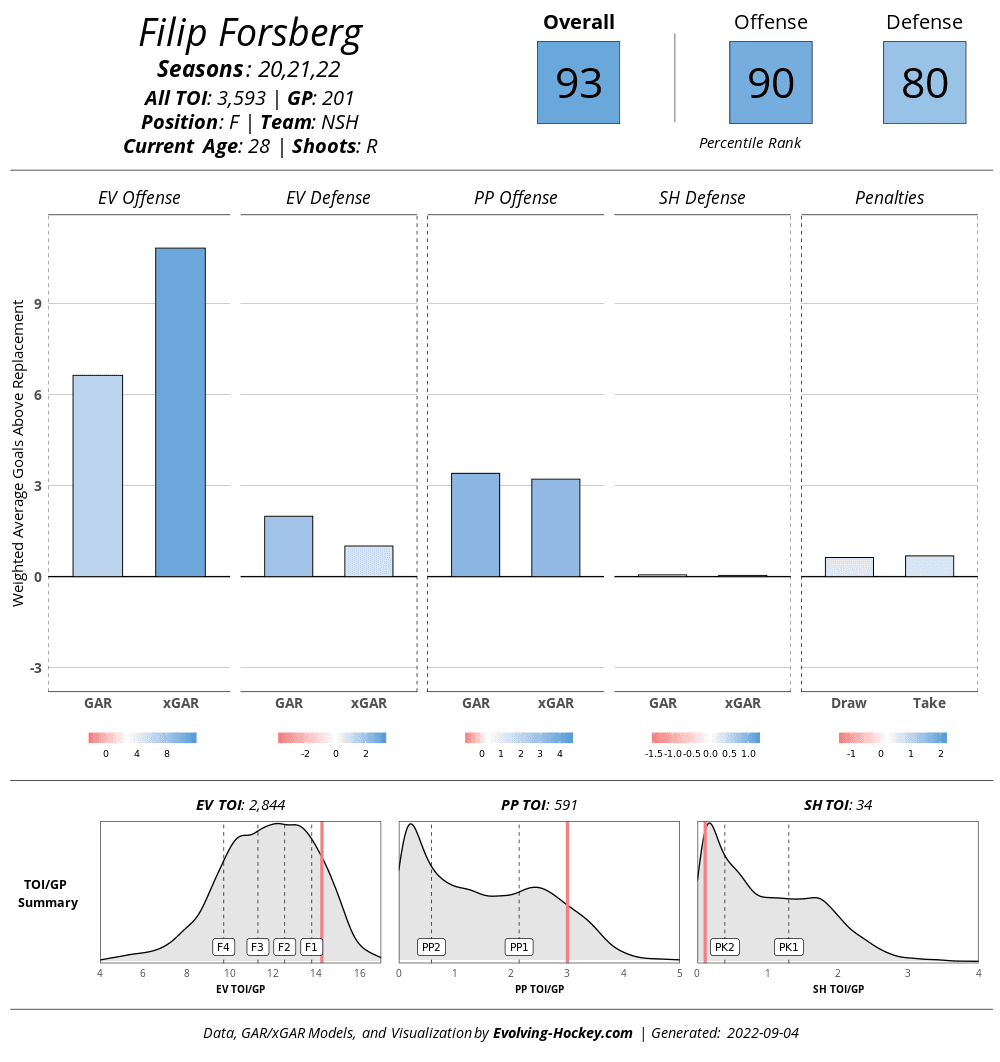 When their sample sizes are narrowed down to the previous three seasons, Miller leads the way with 53 more points than his Swedish counterpart. But if Forsberg’s higher scoring rate at even strength doesn’t narrow the gap enough, his much stronger defensive numbers will.