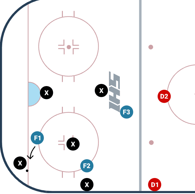 Where we see a different variation is when there’s more of a battle for the puck in the offensive zone corner. The weakside forward now becomes F2 and is ready to jump on the puck or pressure the defenceman on the other side of the ice if it’s moved D-to-D. The strong side forward then becomes the F3 and hangs a bit higher to support the defencemen in case the puck is moved up ice, so the opposing team doesn’t have an odd man rush.