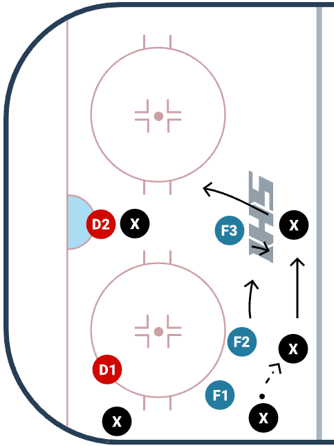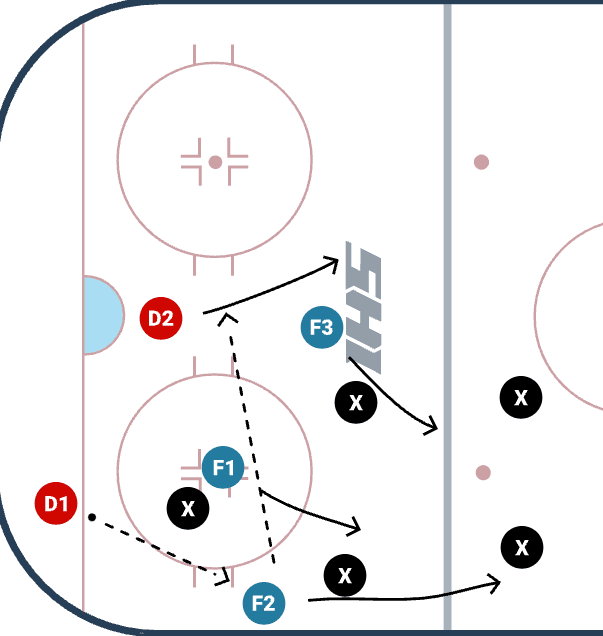 Often, the puck will be moved up to the winger (F2), and they will look for a pass back to the weakside defenceman (D2).