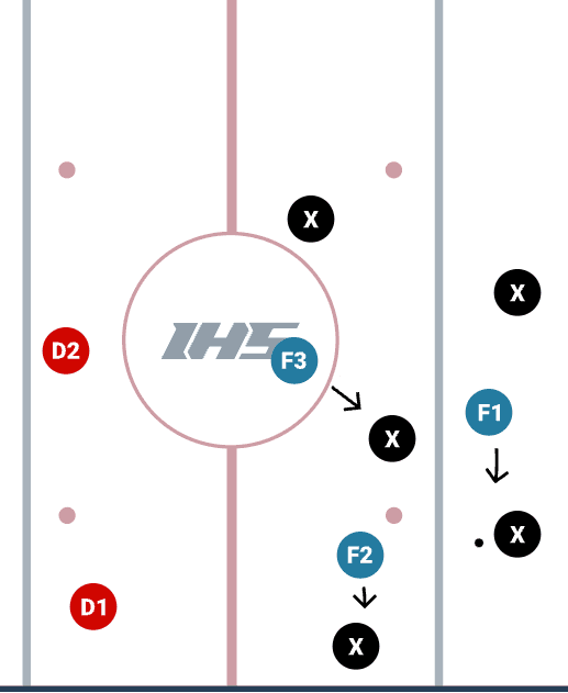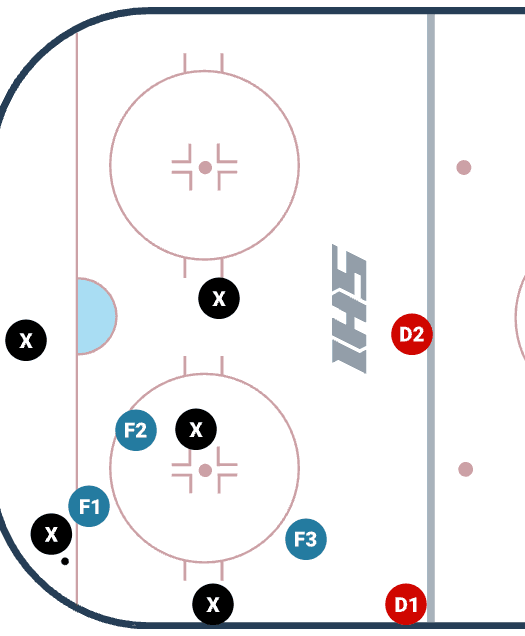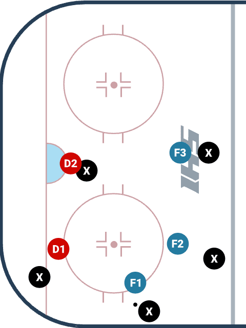 Once the puck is moved up the half wall, they switch into a more true man-on-man coverage. The low forward (F1) that was supporting the defenceman down low is the one to take the player now with the puck on the half wall, while the defenceman in the corner (D1) stays between the opponent’s forward and the net. The net-front defencemen (D2) should then tie up their man to eliminate the possibility of a tip on a shot or of being available to score on a rebound.