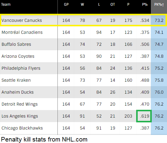 The Canucks have the worst penalty kill success rate over the past two seasons, coming in at 73.2% over their past 164 regular season games.