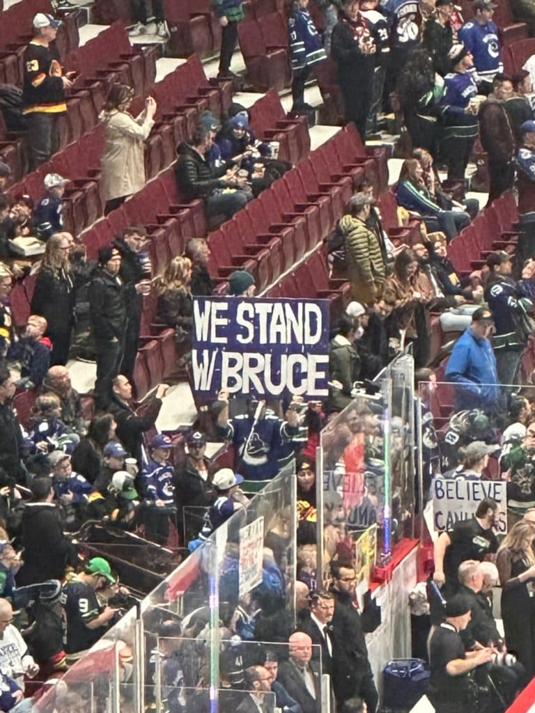 A fan brought a sign reading “WE STAND WITH BRUCE” into Rogers Arena for tonight’s matchup between the Vancouver Canucks and Colorado Avalanche.