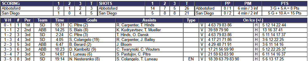 San Diego goal – 5-3 – Nikita Nesterenko from Sam Colangelo and Tristan Luneau (empty net)