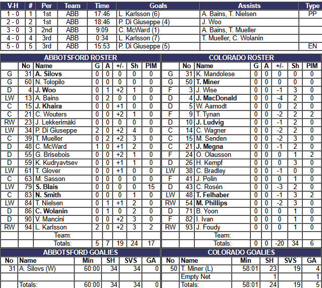 Final shots: ABB 24, COL 32 | Score: ABB 5, COL 0