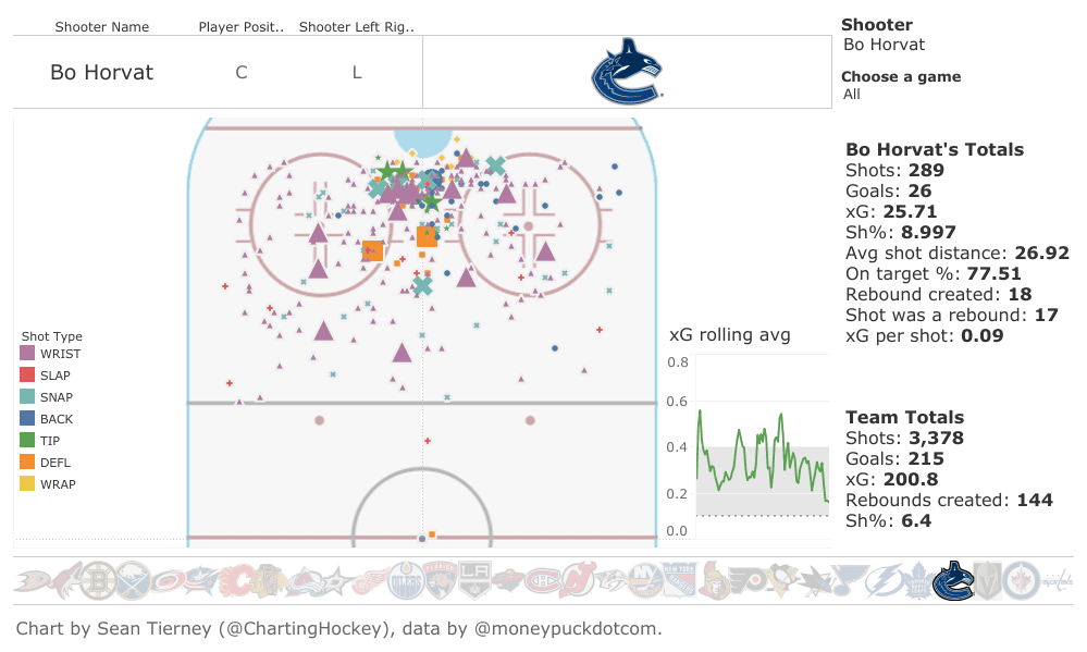 While viewing both Ferland and Horvat’s shot maps from last season, they play a similar game — while Horvat had much more ice-time and therefore a bigger total of chances. But they both have a similar gameplan and while that can work in some cases, there might be a better option that’s heading into his sophomore year in the NHL.