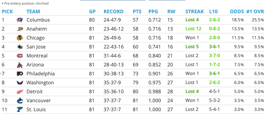 In order to move up to the ninth-best odds, currently held down by Detroit, the Canucks would need to lose tonight and for Detroit to win. Either that, or the Canucks lose and get a win from Washington, as the Capitals have the “advantage” with regulation wins, meaning they and the Canucks both finishing the season at 81 points would give Vancouver the better lottery odds.