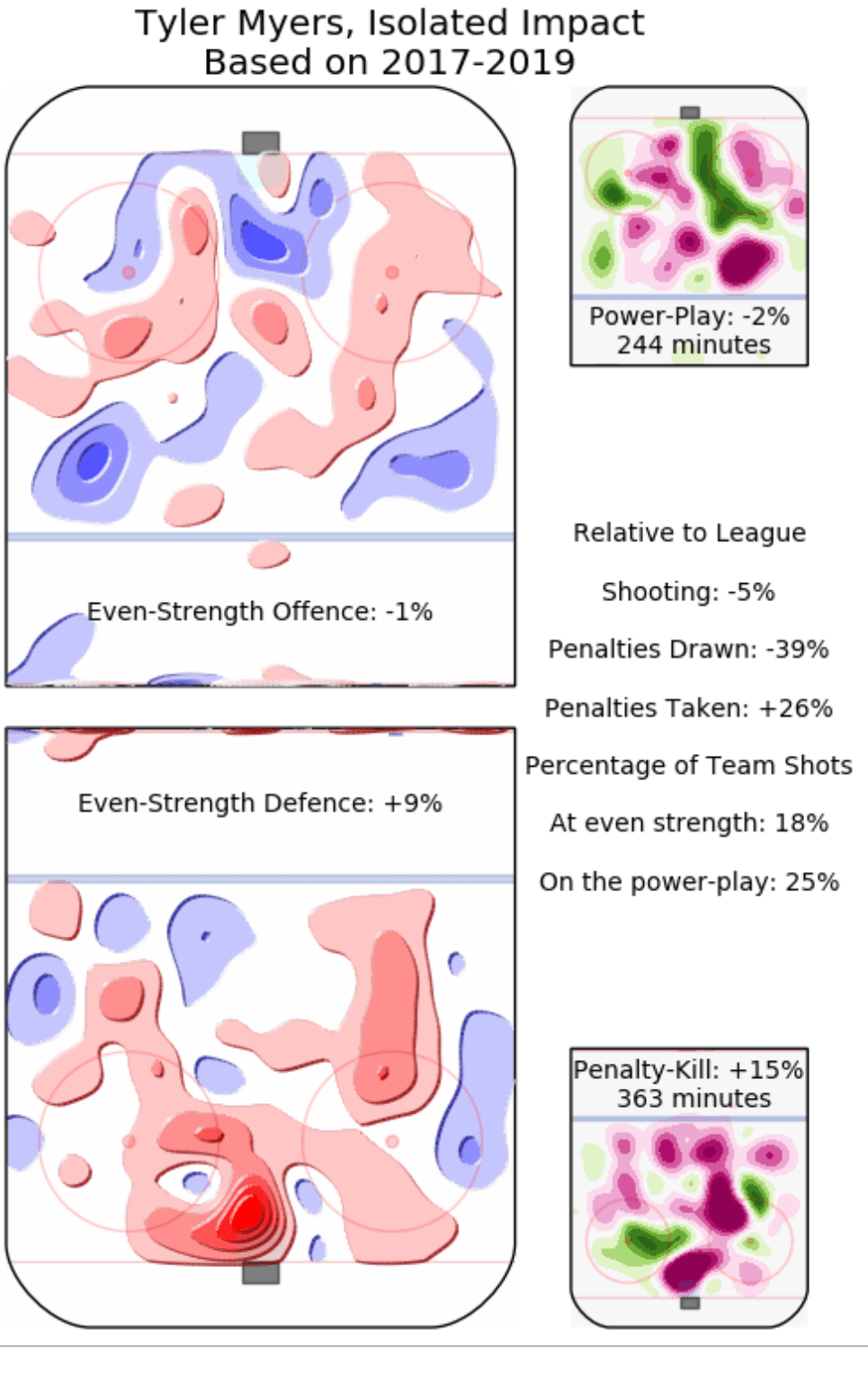 Micah Blake McCurdy’s Threat model, which attempts to isolate the individual impact of a player on shot rates from the impact of a number of confounding factors such as teammates, their opponents, score effects, zones starts, and home-ice advantage, doesn’t look very favourably on Myers, either. Threat estimates Myers to be slightly below league average in both the offensive and defensive zones and on the man advantage.* The EvolvingHockey Goals Above Replacement (GAR) model doesn’t look very kindly on Myers, either, placing him in the bottom-fifty among qualifying defenders.