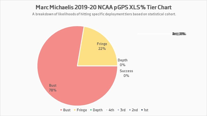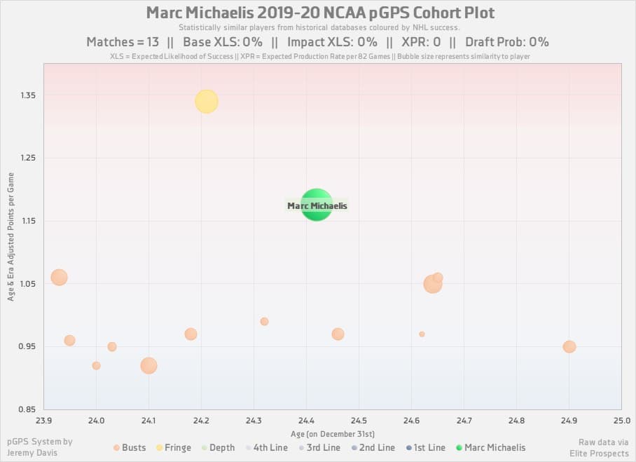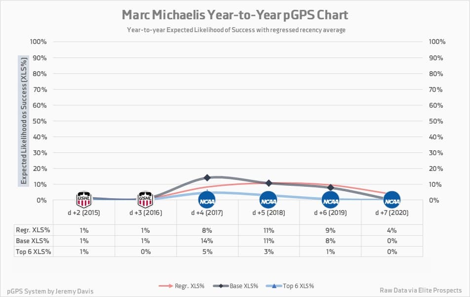 It’s also important to note that in spite of Michaelis’ lacklustre cohort from this season, he hovered around the 10% mark in base XLS% for each of his prior three seasons. Given the offensive consistency he showed over the course of his NCAA career, I would say that those years are probably more indicative of his chances at becoming an NHL regular than his numbers from this season.